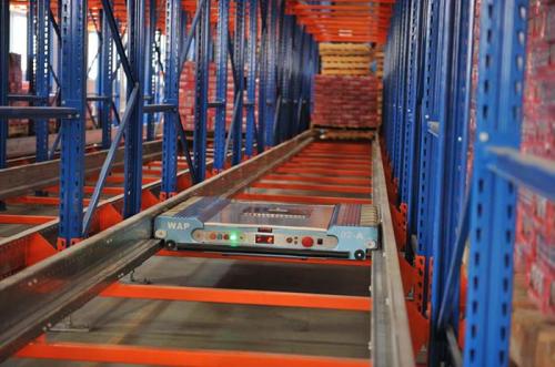 ·取貨:WAP-1穿梭車將貨架深處的托盤移動至貨架最前端,用叉車將托盤貨物從貨架上取下;